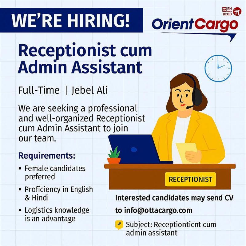 Are you an organized, proactive, and customer-focused professional looking to build your career in administration and operations? A Cargo Company in Jebel Ali is hiring a Receptionist cum Admin Assistant to join in Jebel Ali, Dubai. This is a full-time opportunity for candidates who can effectively manage front desk responsibilities while supporting daily administrative and operational functions.